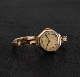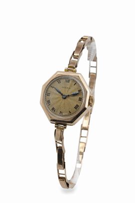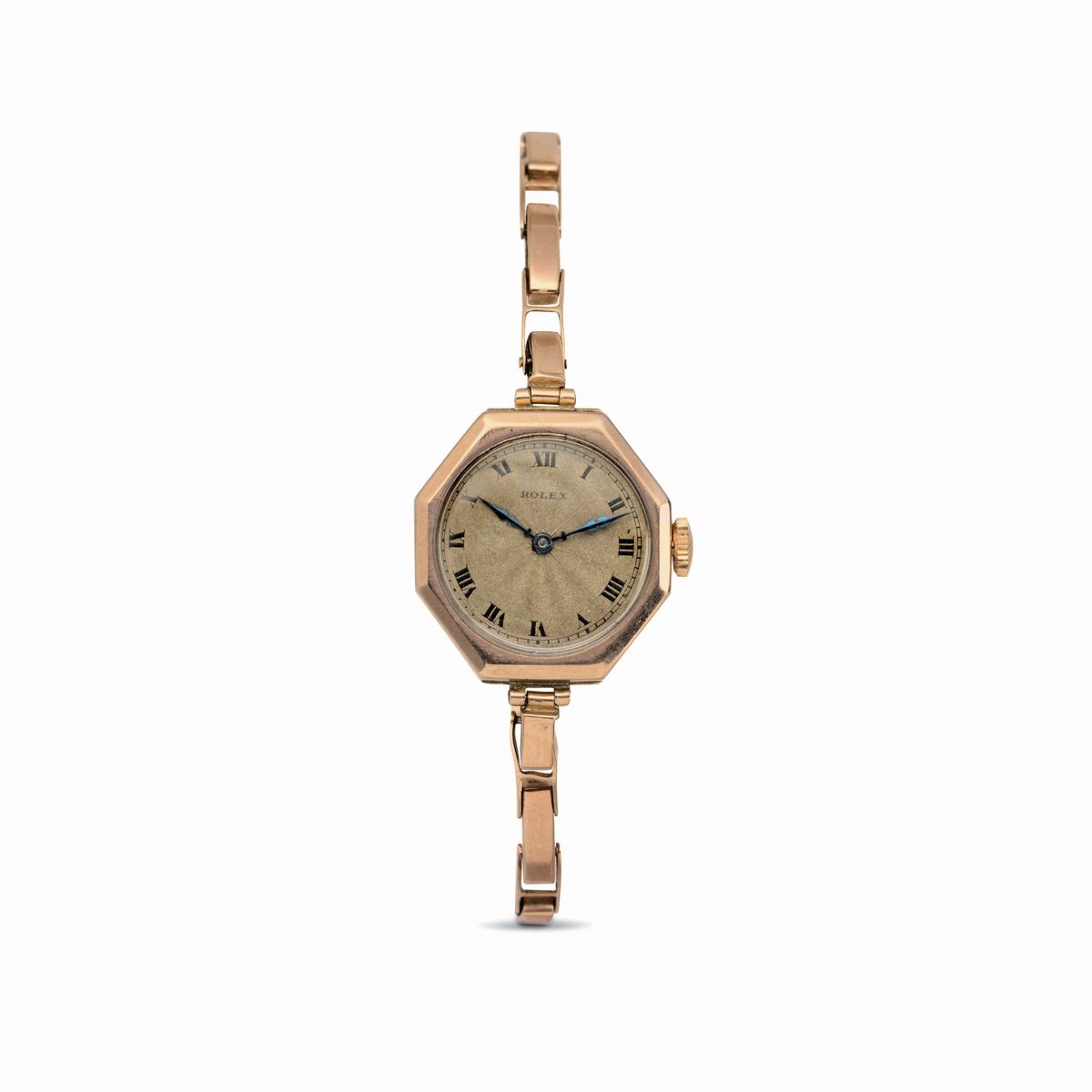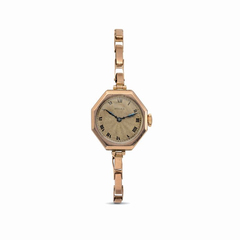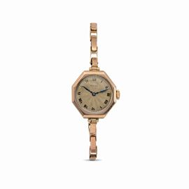 Raro orologio Marconi in oro rosa 9k della prima parte del XX secolo quadrante argentè flinquè con numeri Romani, lancette in acciaio azzurrate