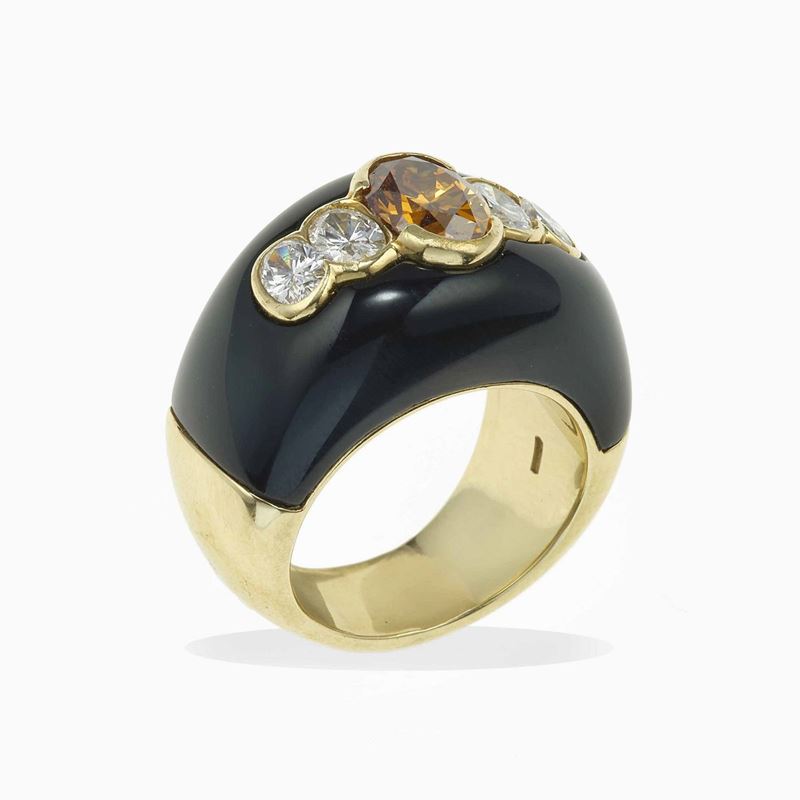 Anello a fascia con diamante centrale fancy orangy brown di ct 1.48, irradiato