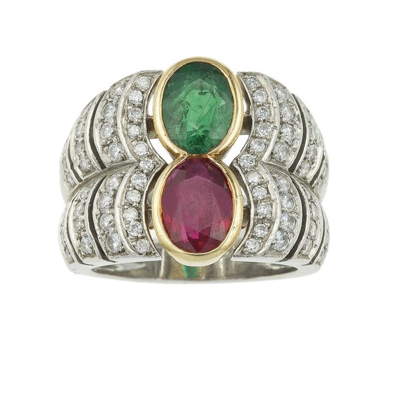 Capello. Anello con rubino Thailandia, smeraldo e piccoli diamanti