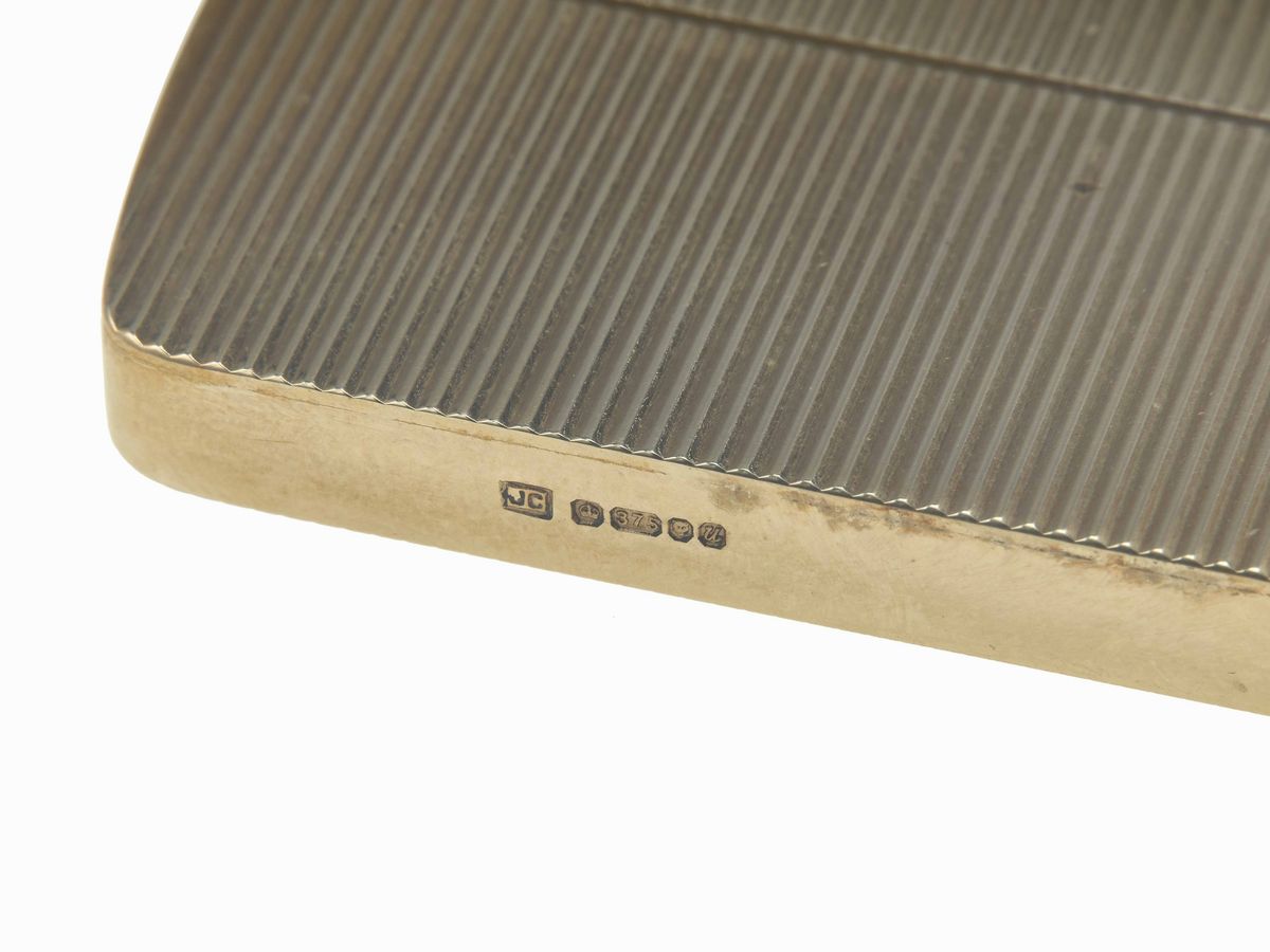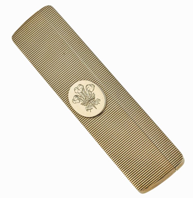 oro 9Kt, placcato in oro 22Kt, Londra, XX secolo. Insegne del Principe di Galles. Astuccio originale