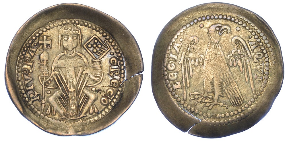 Il patriarca Gregorio seduto frontale regge lunga croce e libro. R/ Aquila ad ali spiegate. Bernardi 22. Rara. g. 0,97. Diam. mm. 19,85. Arg. Frattura di conio. q.BB