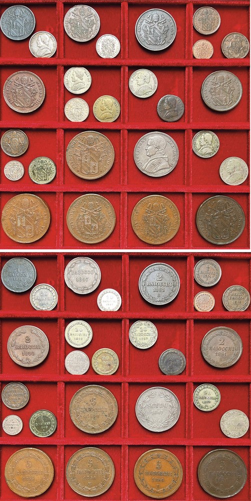 Monetazione mista coniata durante il pontificato di Pio IX, fra cui si segnalano: Scudo 1847 (raro, tracce di appiccagnolo) 10 Baiocchi 1858 (molto raro) - 5 Baiocchi 1850 (raro). Argento e rame. Conservazioni varie.