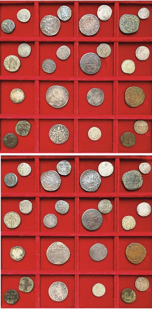 Monetazione mista dal XVII al XVIII secolo, fra cui si segnalano: URBANO VIII, 1623-1644. Gabellone 1624 (molto raro) - ALESSANDRO VII, 1655-1667. Lira 1666 - INNOCENZO XII, 1691-1700. Carlino 1692. Argento e rame. Conservazioni varie.