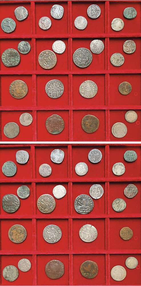 Monetazione mista dal XVII al XVIII secolo, fra cui si segnalano: INNOCENZO XI, 1676-1689. Lira 1683 (rara) - Carlino 1682 - CLEMENTE XI, 1700-1721. Muraiola da 4 Bolognini 1710 (molto rara). Argento e rame. Conservazioni varie.