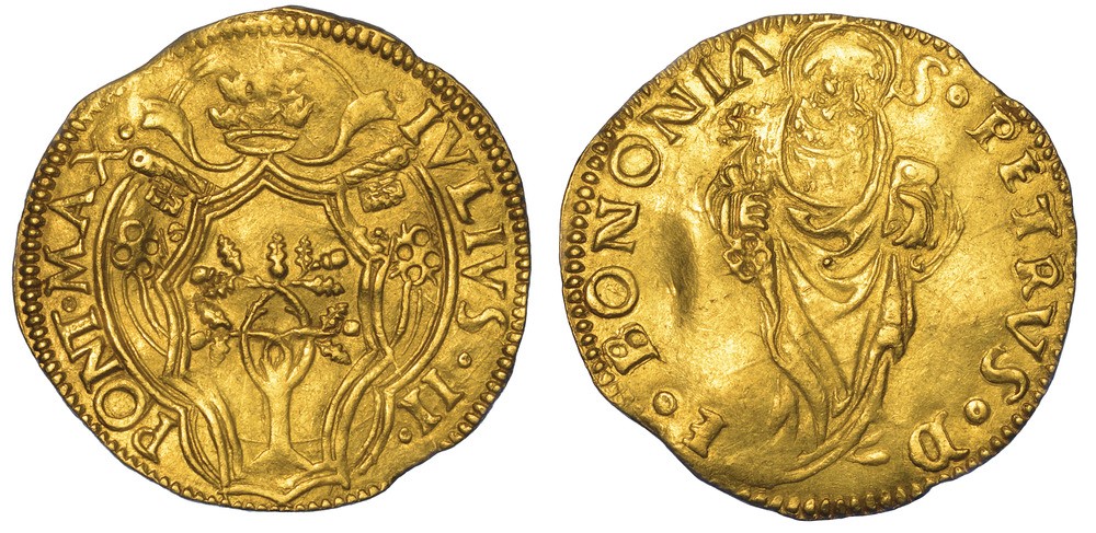Stemma sormontato da triregno e chiavi decussate, entro doppia cornice quadrilobata. R/ S. Pietro stante di fronte con libro e chiavi. MIR 577. Munt. 90. CNI 15 v. Raro. g. 3,45. Diam. mm. 22,99. Oro. Lieve ondulazione. q.BB