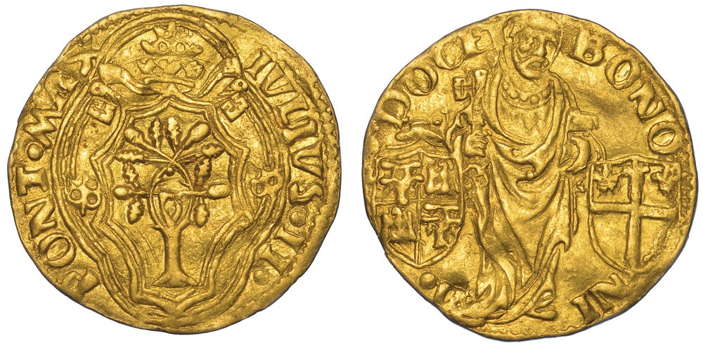 Stemma sormontato da triregno e chiavi decussate, entro doppia cornice quadrilobata. R/ S. Pietro stante di fronte con libro e chiavi. Ai lati, armetta del Cardinale Legato Francesco Alidosi e a d. quella della città. MIR 577/1. Munt. 84. CNI 22. g. 3,41. Diam. mm. 22,86. Oro. BB