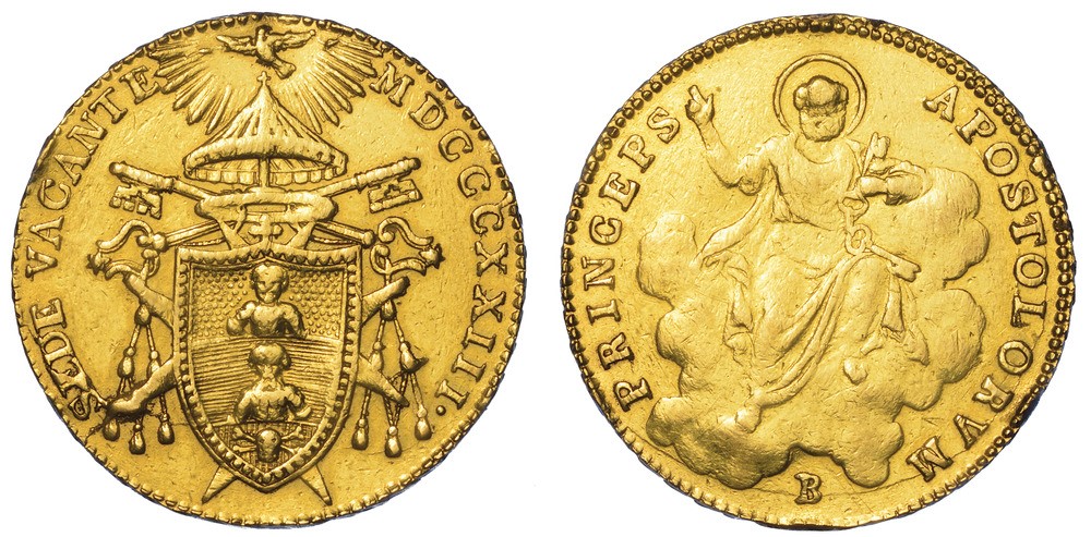 Stemma sormontato da chiavi e padiglione. R/ S. Pietro tra le nubi. Gig. 2. Molto rara. g. 5,38. Diam. mm. 22,53. Oro. Tracce di montatura. BB