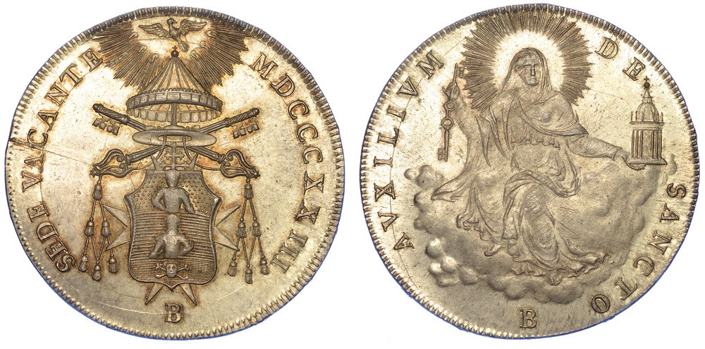 Stemma sormontato da chiavi e padiglione. R/ La Santa Chiesa velata, col capo raggiante, seduta su nubi tiene le chiavi e un piccolo tempio a cupola. Gig. 4. Raro. g. 26,52. Diam. mm. 40,00. Arg. Graffi su rottura di conio, altrimenti FDC
