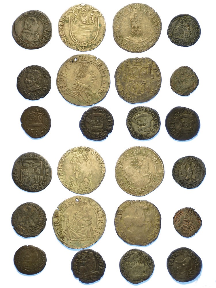 Monetazione mista dal XVI al XVII secolo, fra cui si segnalano: ANONIME DEI CONTI GEROLAMO, GILBERTO, CAMILLO E FABRIZIO, 1569-1580. Giulio da 6 Soldi (2 esemplari di differenti tipologie, entrambi rari) - SIRO D'AUSTRIA (principe), 1616-1630. Da 8 Soldi (raro, foro). Argento e rame. Conservazioni da B/MB a q.BB.