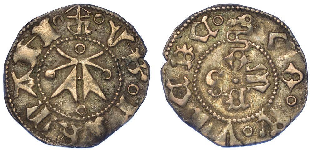Nel campo grande lettera A con 4 anelli. R/ Nel campo O M E S. CNI 12. Raro. g. 0,90. Diam. mm. 17,31. Arg. Buon BB