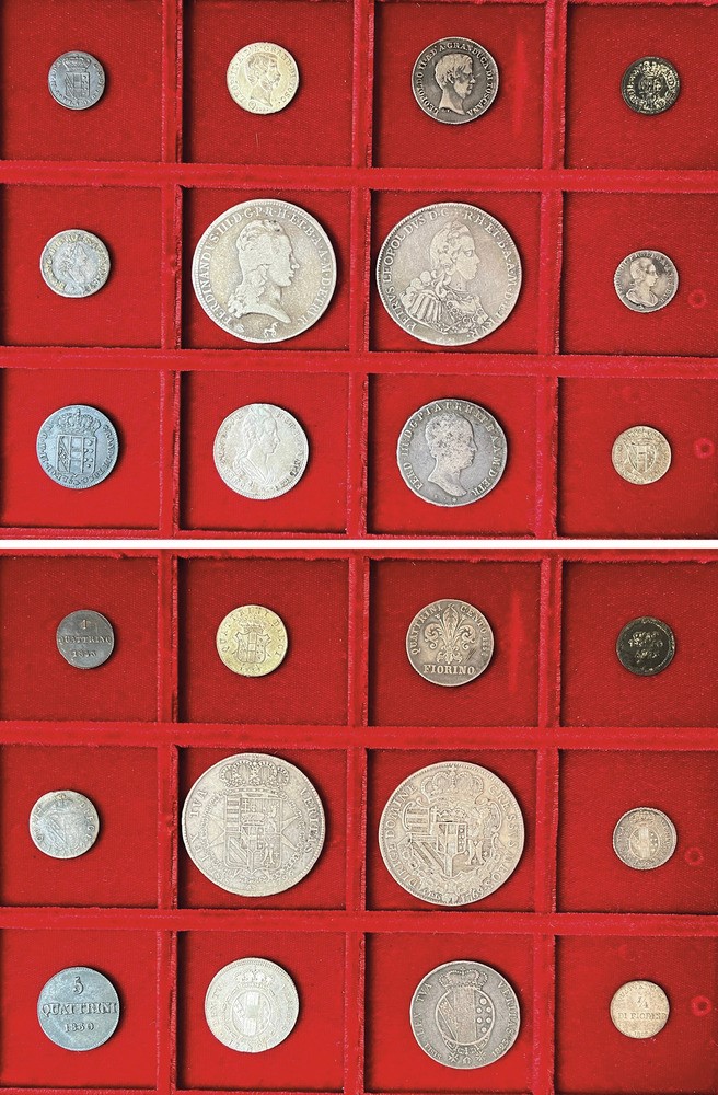 Monetazione mista dal XVIII al XIX secolo, fra cui si segnalano: PIETRO LEOPOLDO DI LORENA, 1765-1790. Francescone 1769 (raro) - FERDINANDO III DI LORENA, 1790-1801 (I periodo). Francescone 1796 (raro) - FERDINANDO III DI LORENA, 1790-1801 (II periodo). Mezzo Francescone 1823 (molto raro). Argento e rame. Conservazioni da B/MB a q.SPL.