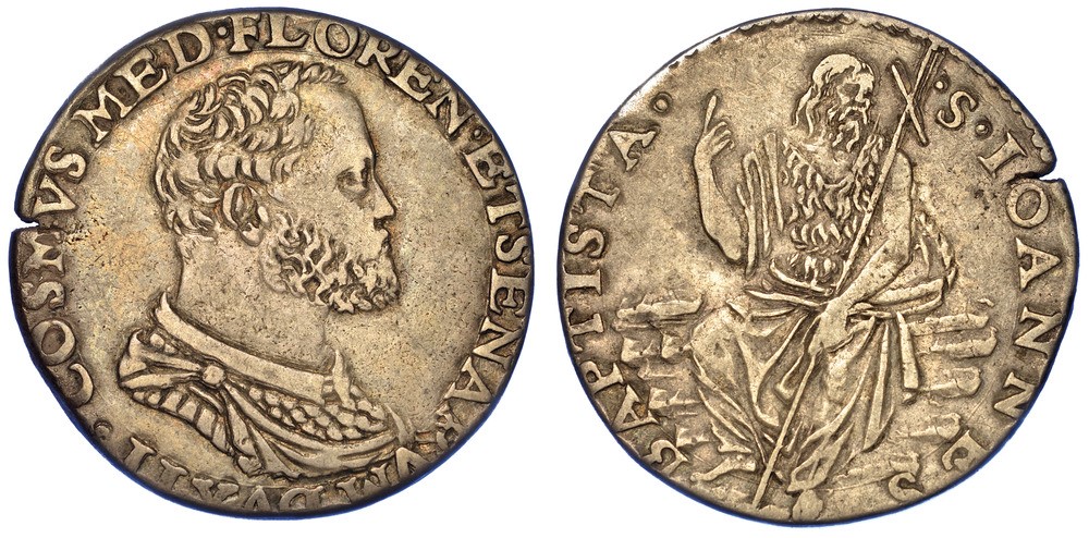 II Busto paludato e corazzato del duca a d. con barba. R/ S IOANNES BAPTISTA San Giovanni Battista, con tunica di pelo e manto, seduto di fronte alza la mano d. nell'atto di predicare e regge con la s. una lunga croce obliqua. MIR 149. CNI 211. Raro. g. 7,55. Diam. mm. 28,74. Arg. Lieve frattura di conio sul bordo, lieve tosatura. q.BB