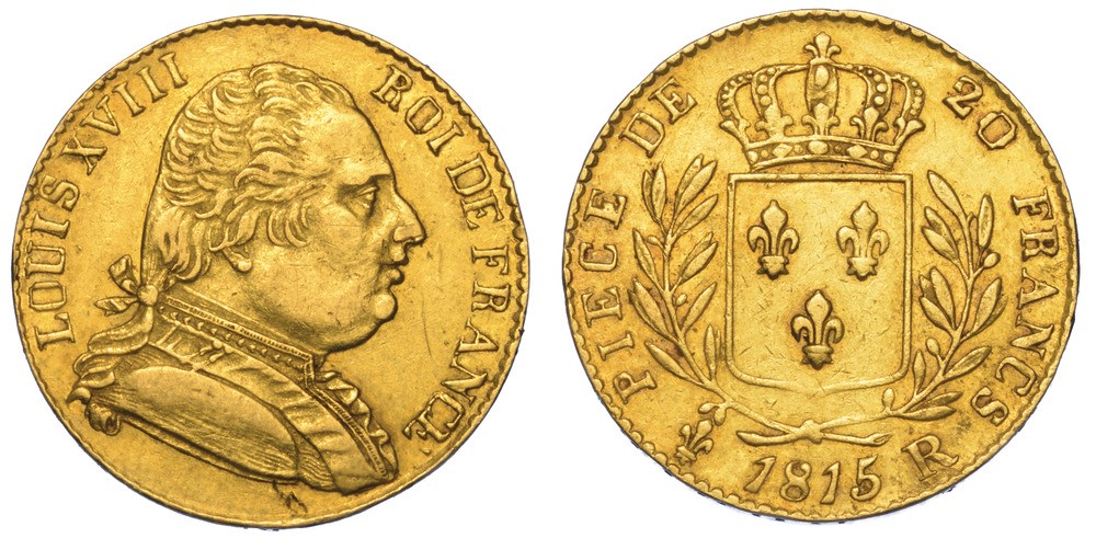 Coniazione speciale realizzata durante il periodo dei cento giorni in cui il governo britannico cercò di rimuovere Napoleone dal potere. Questa moneta venne distribuita ai soldati inglesi per pagare le merci in una valuta che i locali francesi avrebbero accettato.