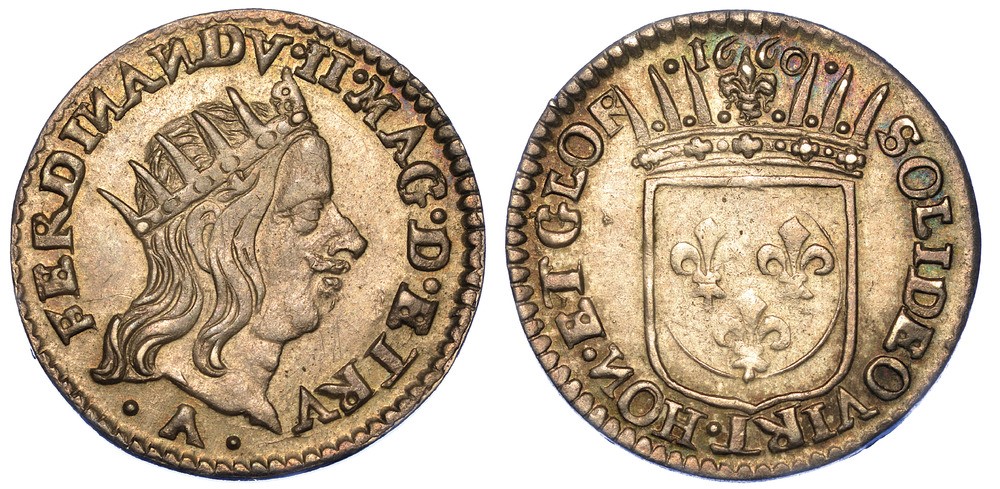 Testa coronata a d. R/ Stemma coronato; in alto, 16 – 60. MIR 60/3. CNI 10. g. 2,21. Diam. mm. 20,20. Arg. Buon BB