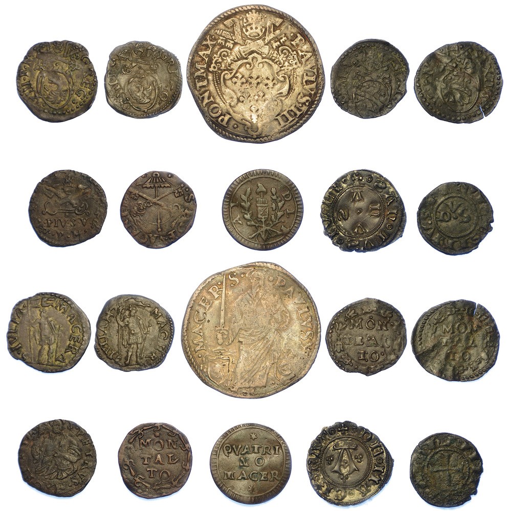 Monetazione mista dal XIV al XVIII secolo, fra cui si segnalano: MACERATA-AUTONOME, XV secolo. Bolognino - MACERATA-PAOLO III, 1534-1549. Paolo (raro) - MONTALTO-SEDE VACANTE, 1590. Quattrino (molto raro). Argento e rame. Conservazioni da B/MB a BB.