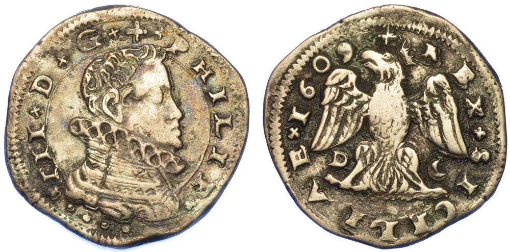 Busto drappeggiato e corazzato a d. con colletto alla spagnola. R/ Aquila coronata, con ali spiegate; ai lati, D - C. MIR 345/1. Spahr 21. g. 9,98. Diam. mm. 28,88. Arg. MB/BB