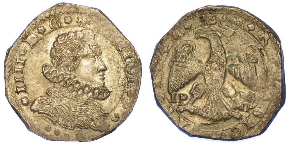 Busto drappeggiato e corazzato a d. con colletto alla spagnola. R/ Aquila coronata, con ali spiegate; ai lati, IP MP. MIR 355/13. Spahr 14. g. 10,51. Diam. mm. 30,33. Arg. q.SPL