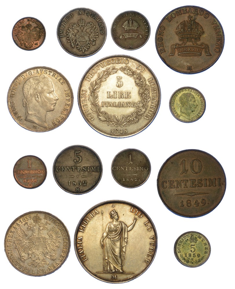 Monetazione mista del XIX secolo, fra cui si segnalano: GOVERNO PROVVISORIO DI LOMBARDIA, 1848. 5 Lire 1848 - FRANCESCO GIUSEPPE D'ASBURGO LORENA, 1848-1866. Fiorino 1859. Argento e rame. Conservazioni da MB a BB/SPL.