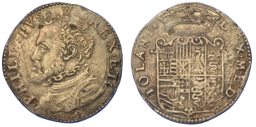 Busto a s. con corazza, goletta con colletto pieghettato e Collare del Toson d’oro; sopra la testa, piccola corona. R/ Stemma sormontato da corona aperta. Crippa 35/A. Raro. g. 6,07. Diam. mm. 28,44. Arg. MB/BB
