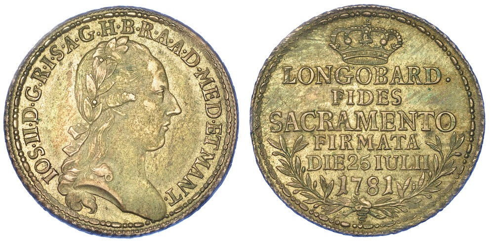 Testa di Giuseppe II a d. R/ Legenda e data in sei righe sormontate da una corona e affiancata alla base da due rami di alloro. Crippa 10. CNI 8. Raro. g. 6,25. Diam. mm. 26,47. Arg. BB