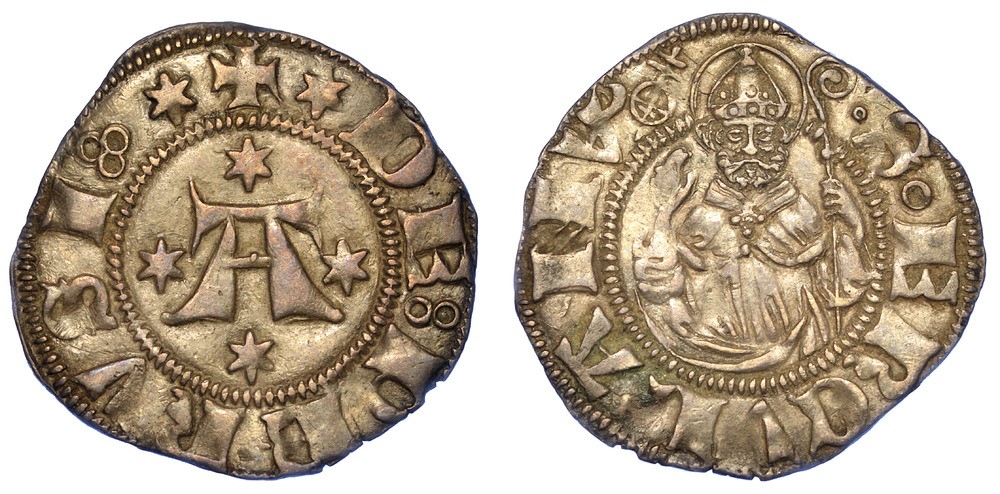 Grande A tra quattro stelle. R/ Busto di S. Ercolano che fuoriesce in alto dal cerchio perlinato. CNI 8. Finetti 72. g. 1,04. Diam. mm. 18,26. Arg. BB/q.SPL