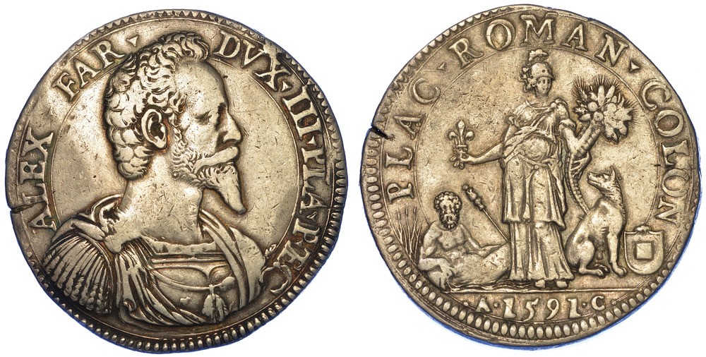 La battitura di questi ducatoni iniziò nel 1590 e proseguì fino al 1620, ben oltre la morte di Alessandro Farnese nel 1592, per volere del figlio Ranuccio di perpetuare la memoria del padre. Il ritratto al diritto è opera di Andrea Casalino. La scena del rovescio è un omaggio alla città di Piacenza, prima colonia romana dell’Italia settentrionale (PLACentia ROMANorum COLONia).