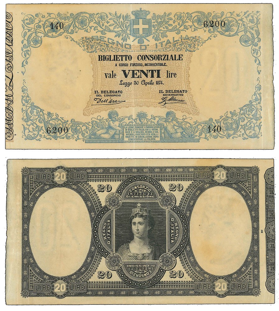 REGNO D’ITALIA. VITTORIO EMANUELE II DI SAVOIA, 1861-1878. BANCA NAZIONALE NEL REGNO. 20 Lire biglietto consorziale 30/04/1874.