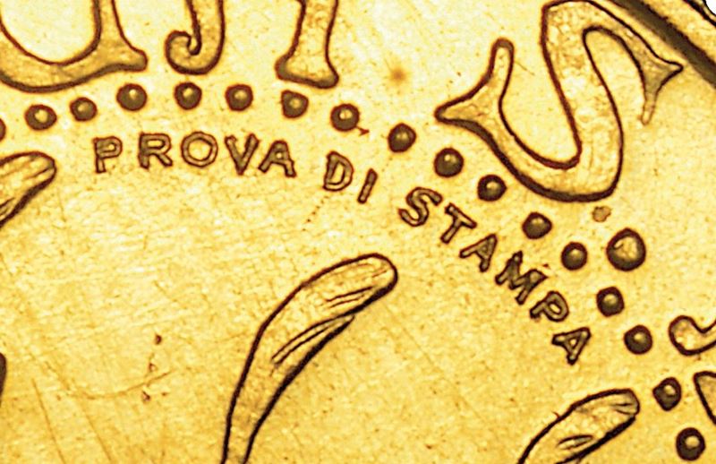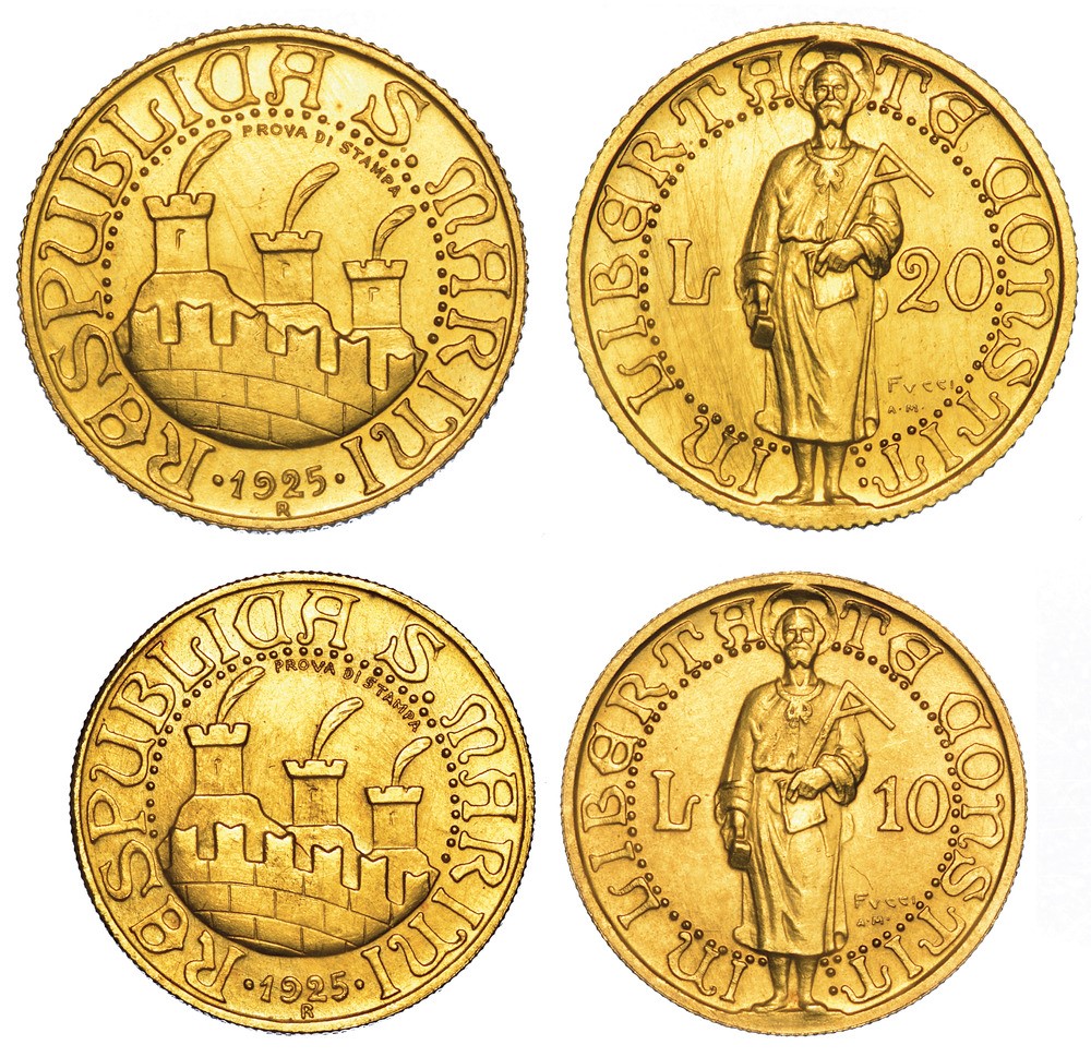 20 Lire 1925. PROVA DI STAMPA. Pagani Prove 565. Rarissimo. g. 6,44. Diam. mm. 20,74. Oro. SPL/FDC (impercettibili graffi) - 10 Lire 1925. PROVA DI STAMPA. Pagani Prove 574. Rarissimo. g. 3,23. Diam. mm. 18,83. Oro. SPL/FDC (impercettibili graffi).