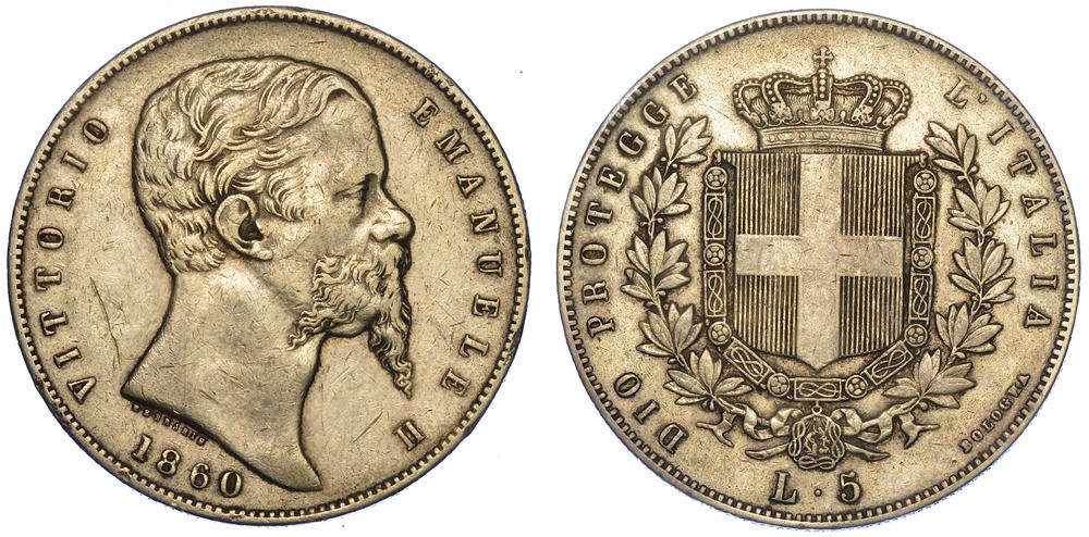 RE ELETTO. VITTORIO EMANUELE II DI SAVOIA, 1859-1861. 5 Lire 1860. Bologna.