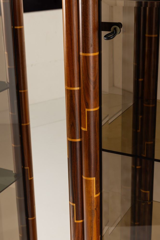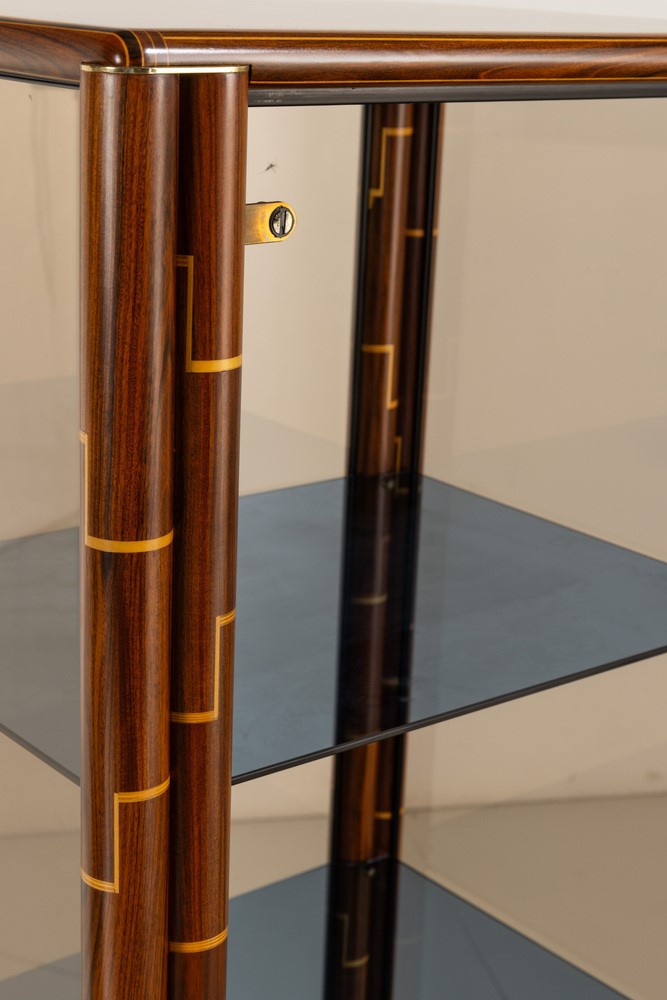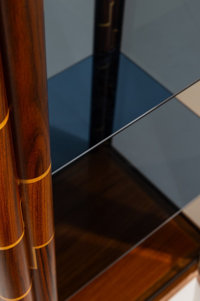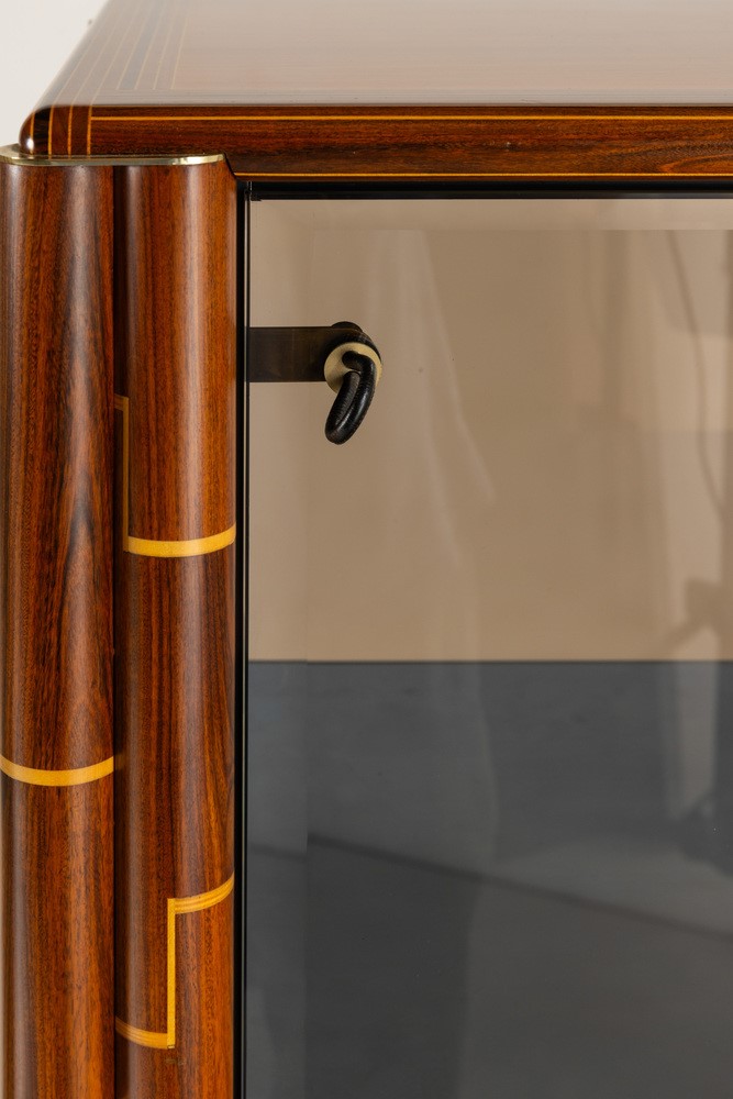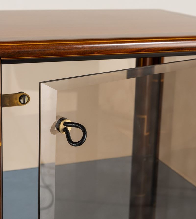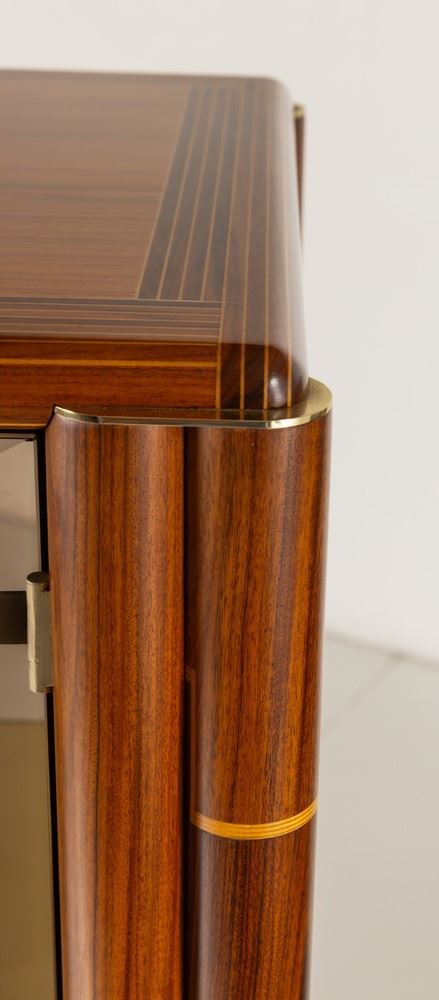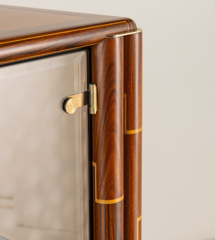 Struttura in legno intarsiato in diverse essenze con ante in vetro colorato. Dettagli e raccordi angolari in ottone. Marchio del produttore.