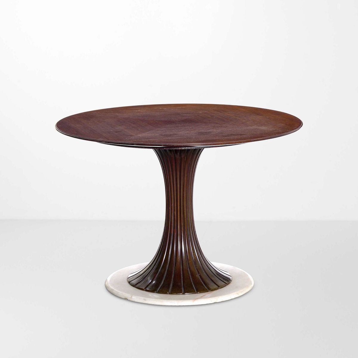 Base in marmo e legno lavorato, piano in legno impiallacciato.