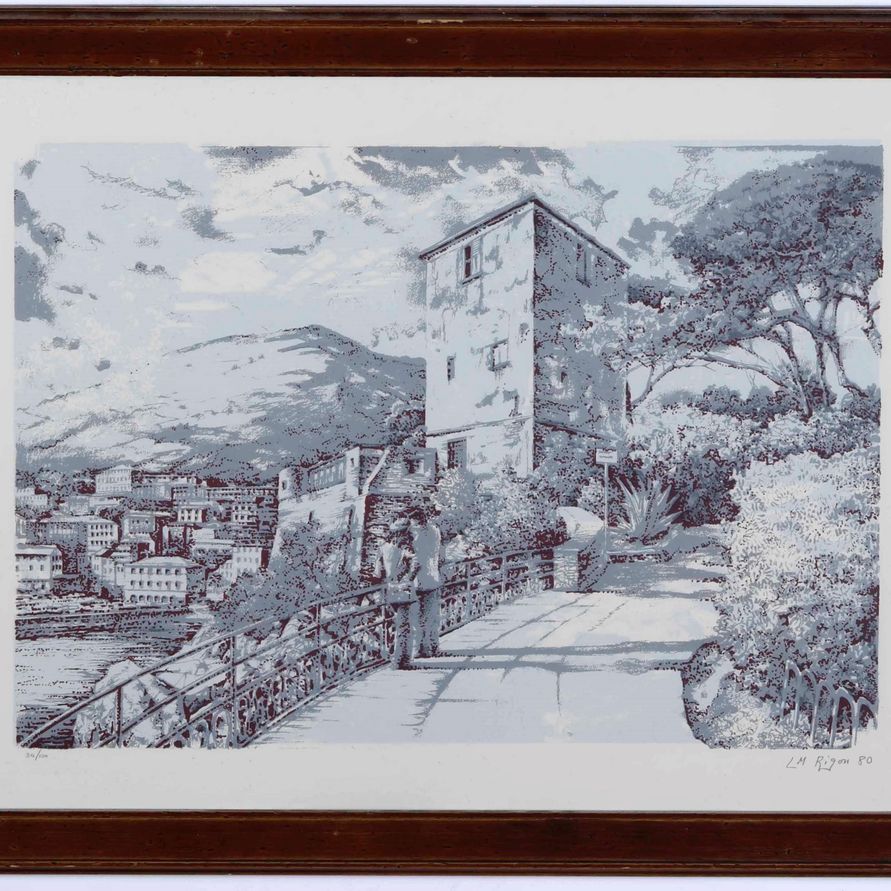 Lotto di stampe, una specchiera marmorizzata e un paesaggio Aldo di Castro olio su tela