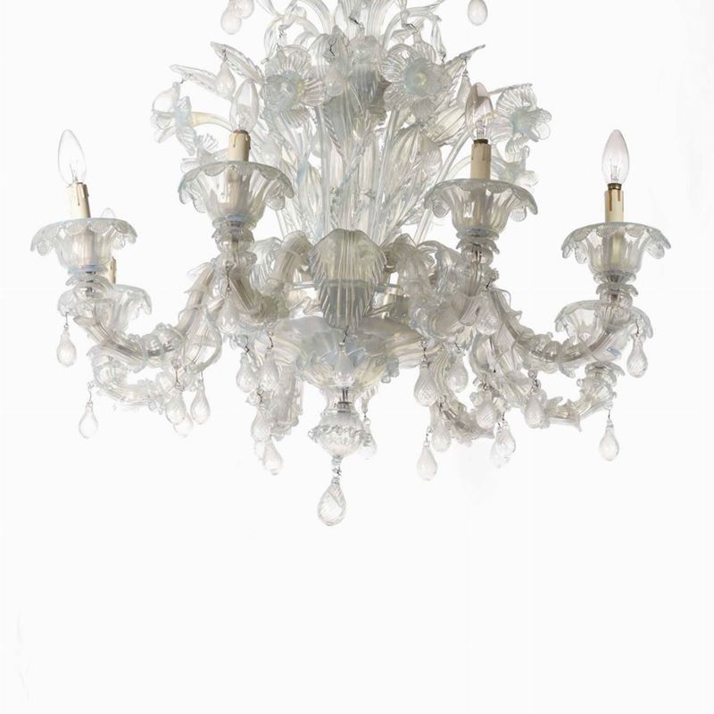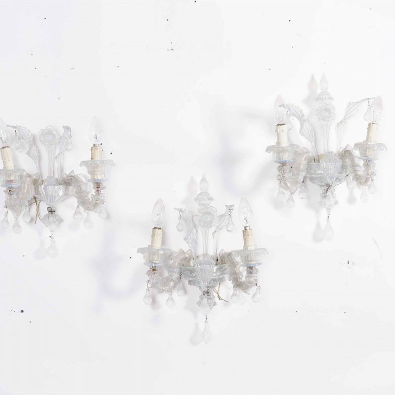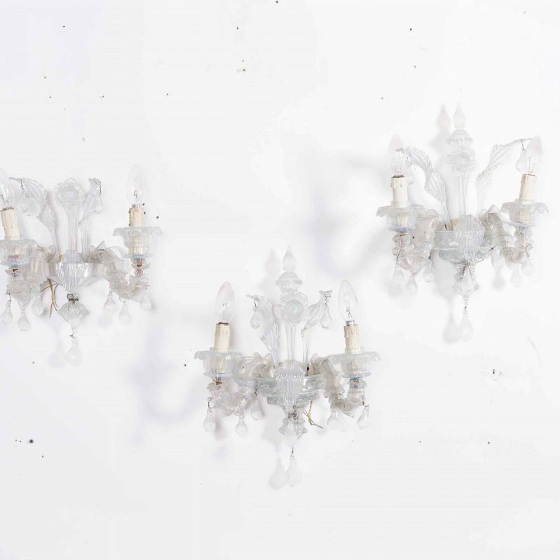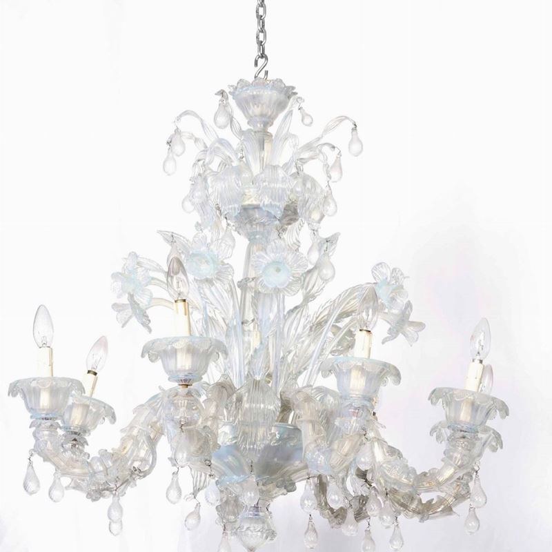 Coppia di lampadari in vetro di Murano lattimo a otto luci e tre applique a due luci, XX secolo