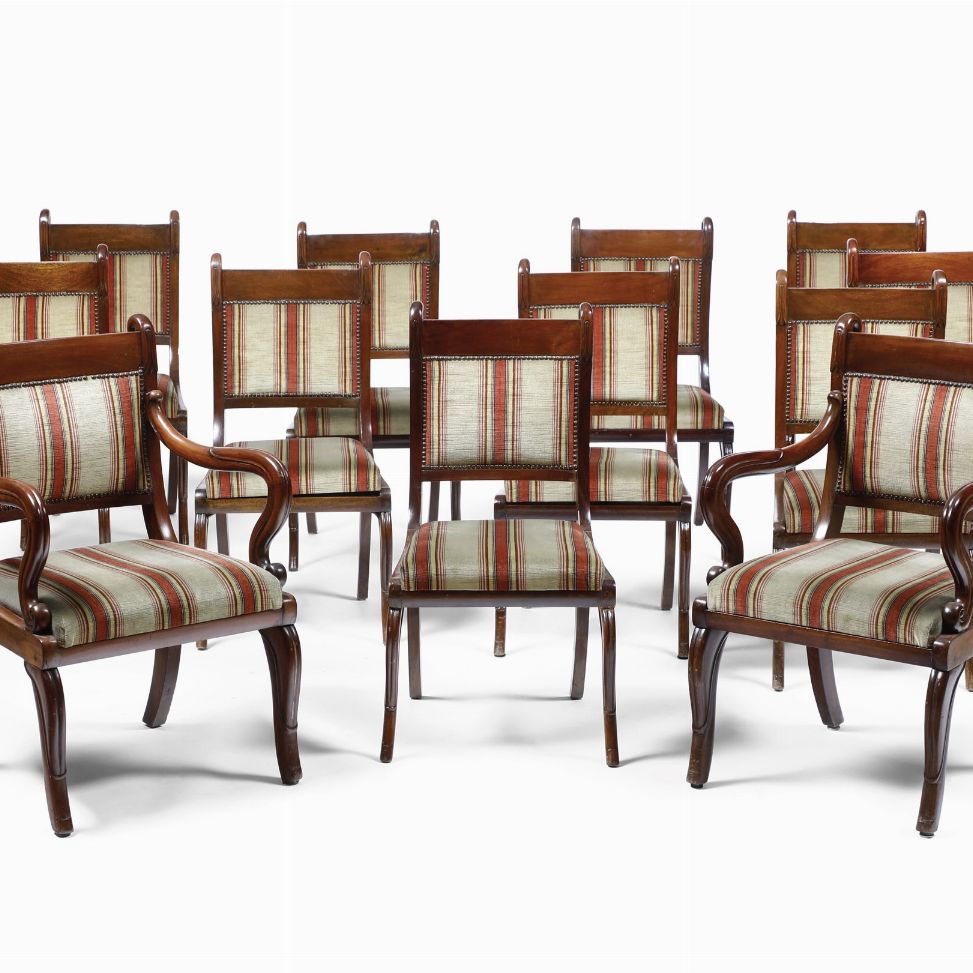Coppia di poltrone e dieci sedie Carlo X in mogano, XIX secolo
