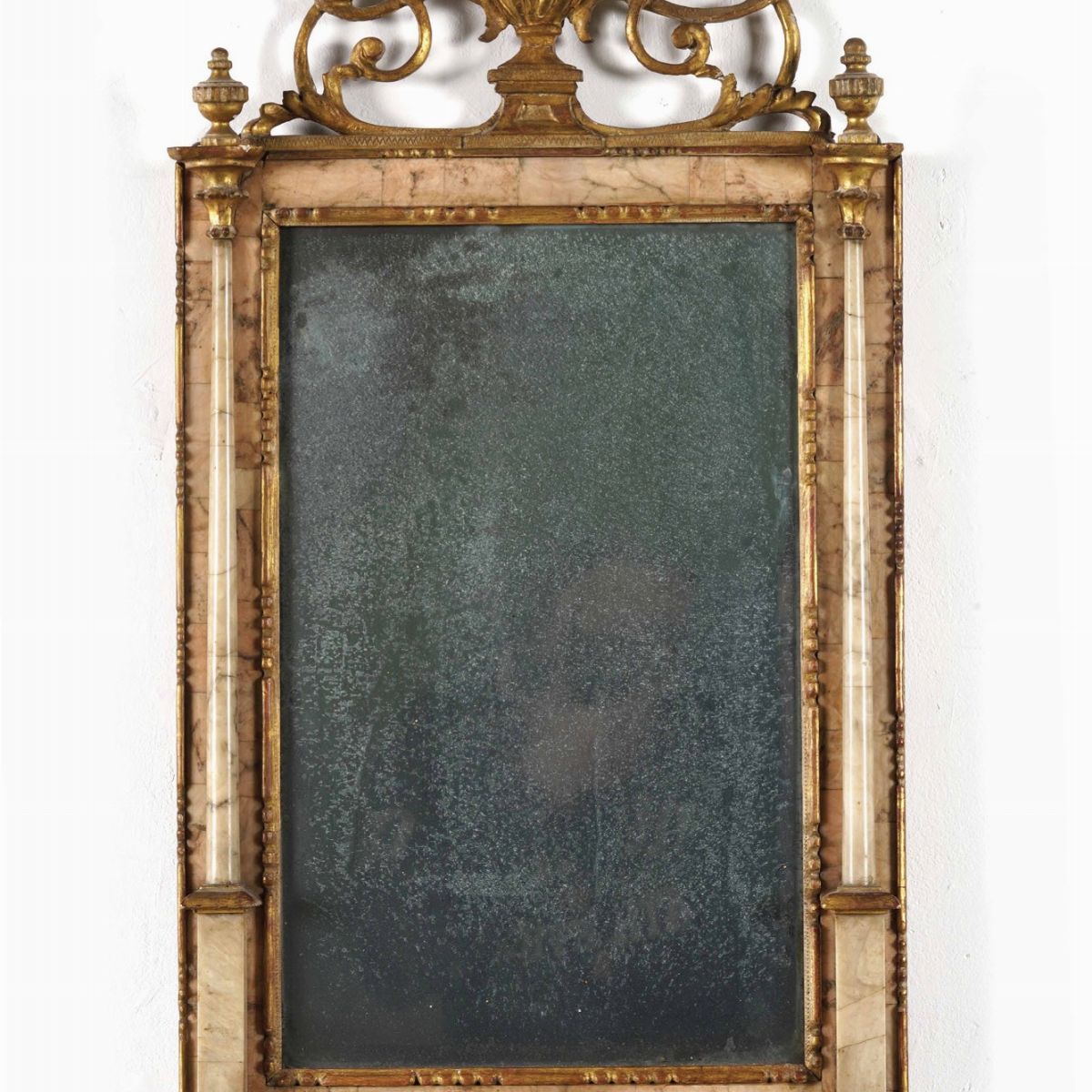 Specchiera in legno intagliato, laccato e dorato e marmo. XIX secolo