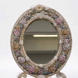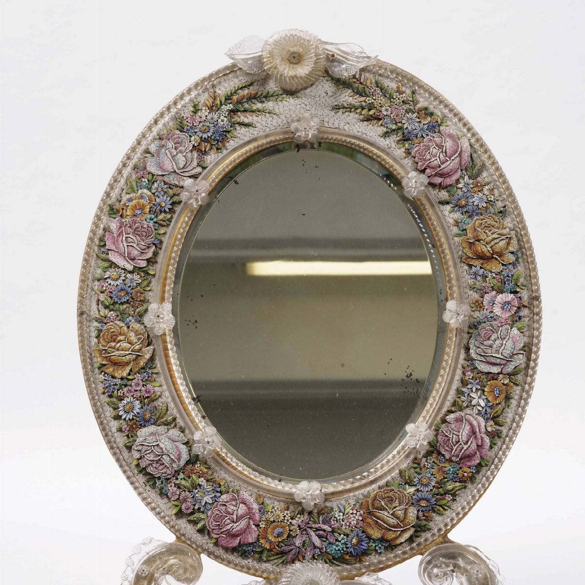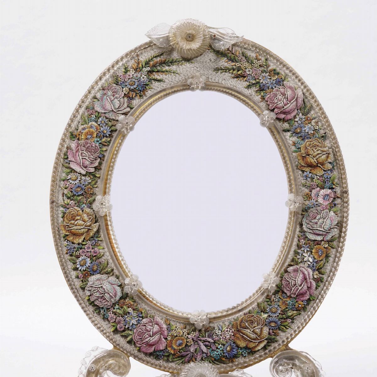 Specchierina ovale con cornice in micro mosaico floreale. XX secolo