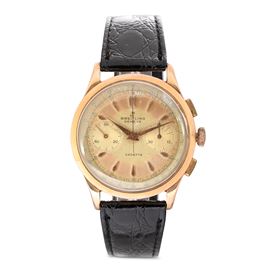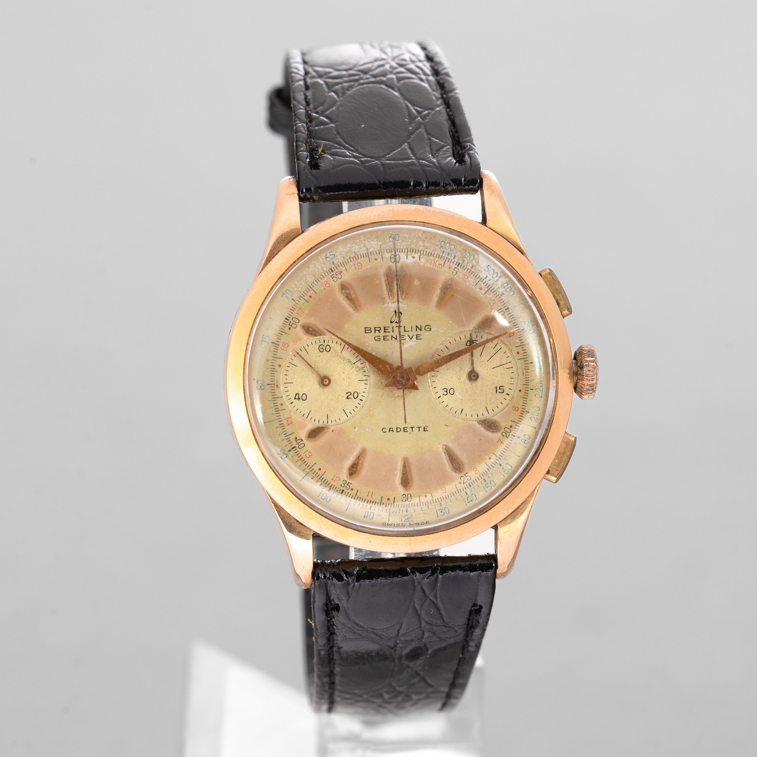 Breitling Cadette cronografo due contatori, tasti quadri, in oro giallo 18k, carica manuale, quadrante bitonale, indici a daga, cinturino in pelle, 37,5 mm, 1950 circa