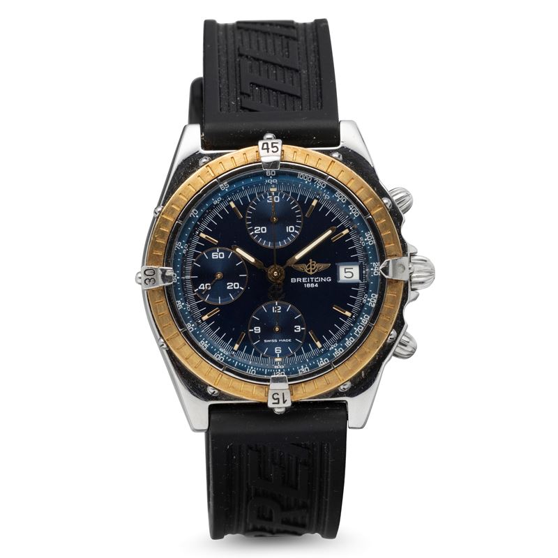 Chronomat in acciaio con ghiera girevole in oro, quadrante blu soleil, movimento automatico e cinturino in gomma, 39 mm