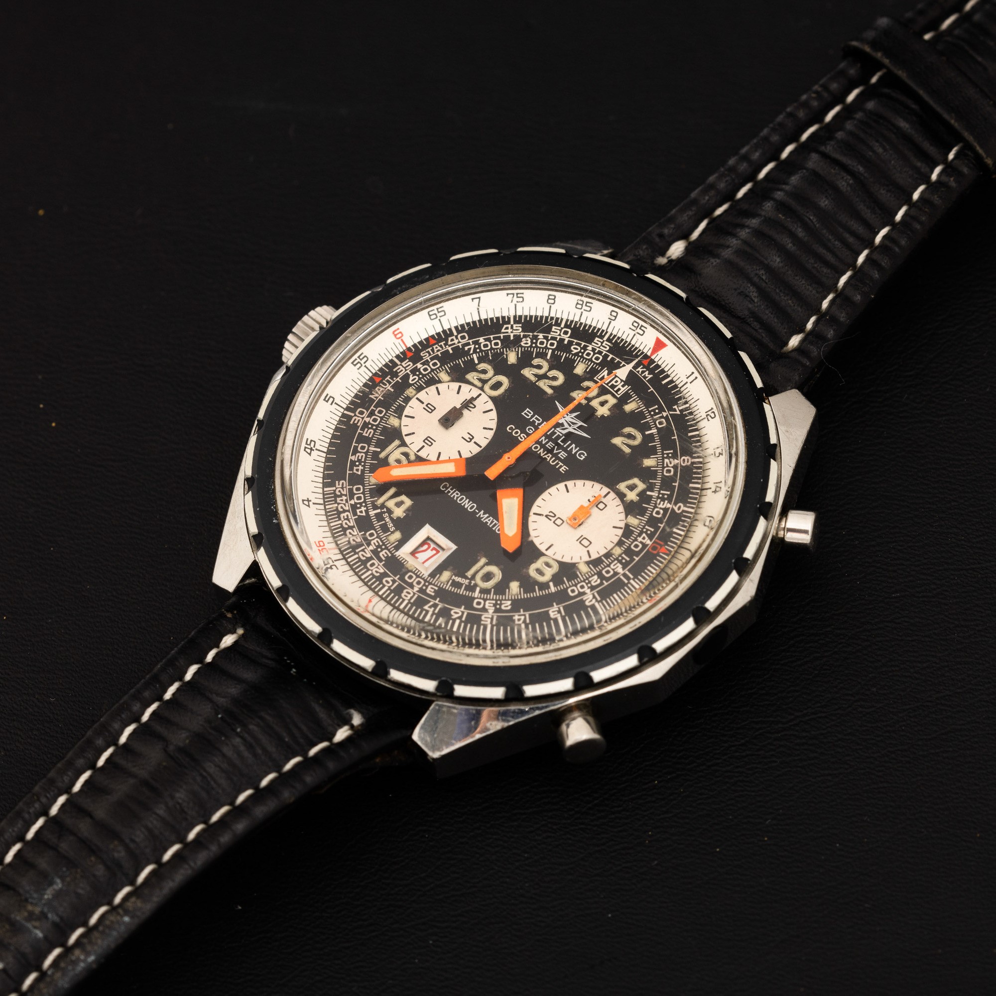Cosmonaute Chronomatic in acciaio cromato, movimento automatico, cronografo con datario, quadrante nero con numeri Arabi luminosi 47x48 mm