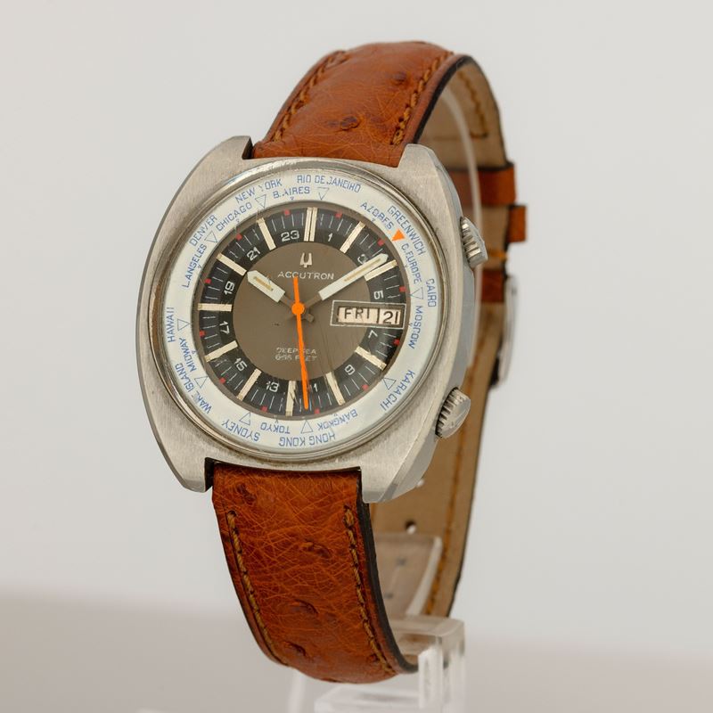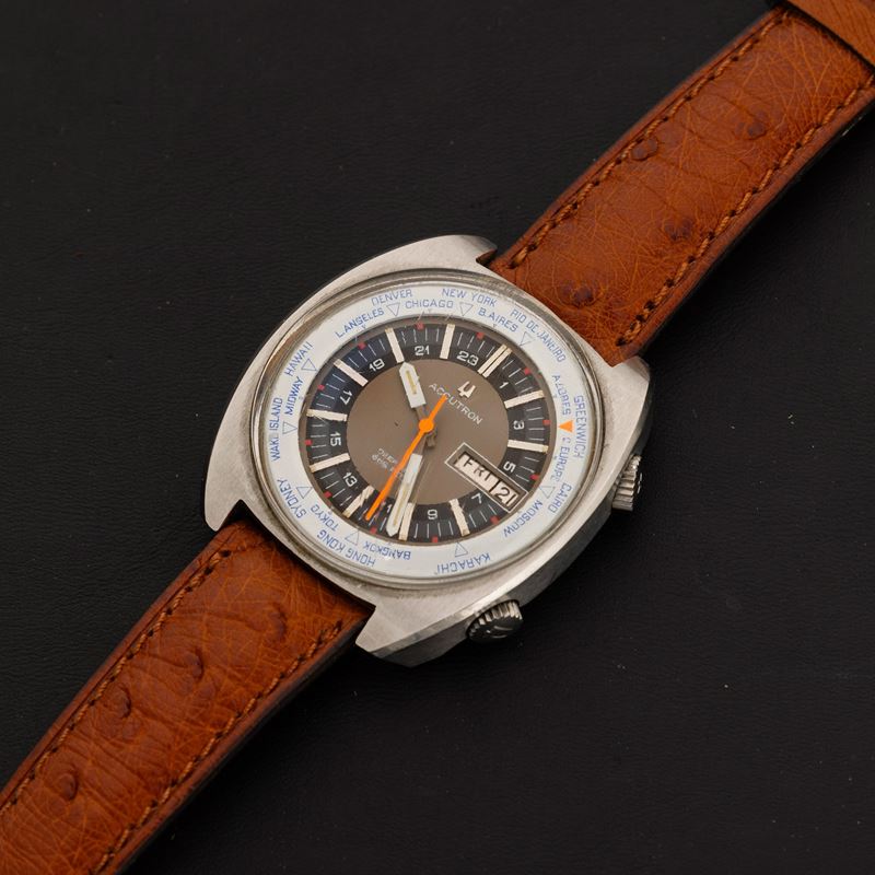 Accutron Worldtimer in acciaio con datario, movimento al quarzo e indicazione dei 24 fusi orari, cinturino in pelle, 39x41 mm
