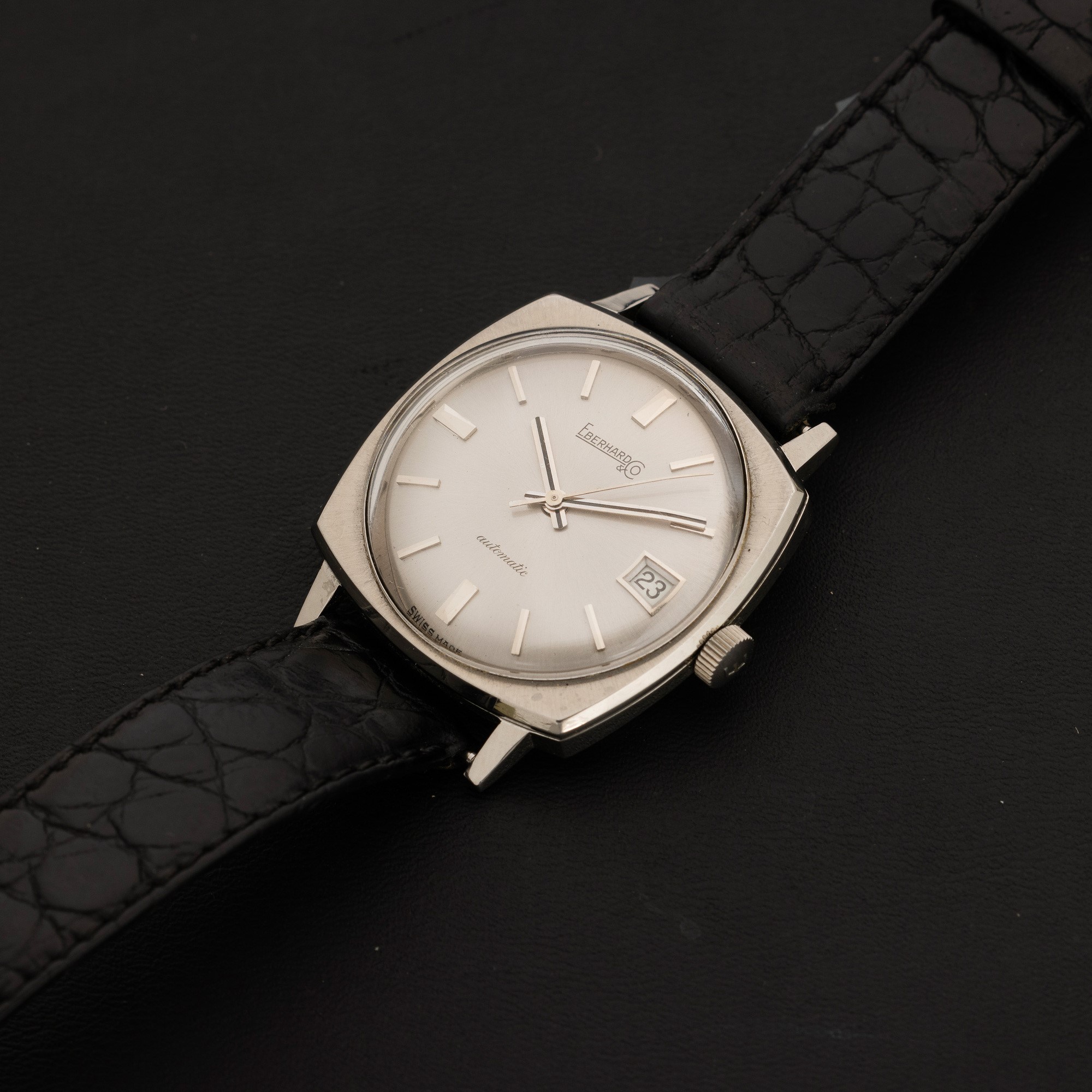 Automatic di forma a cuscino in acciaio con datario, quadrante grigio scuro e indici applicati, 33mm