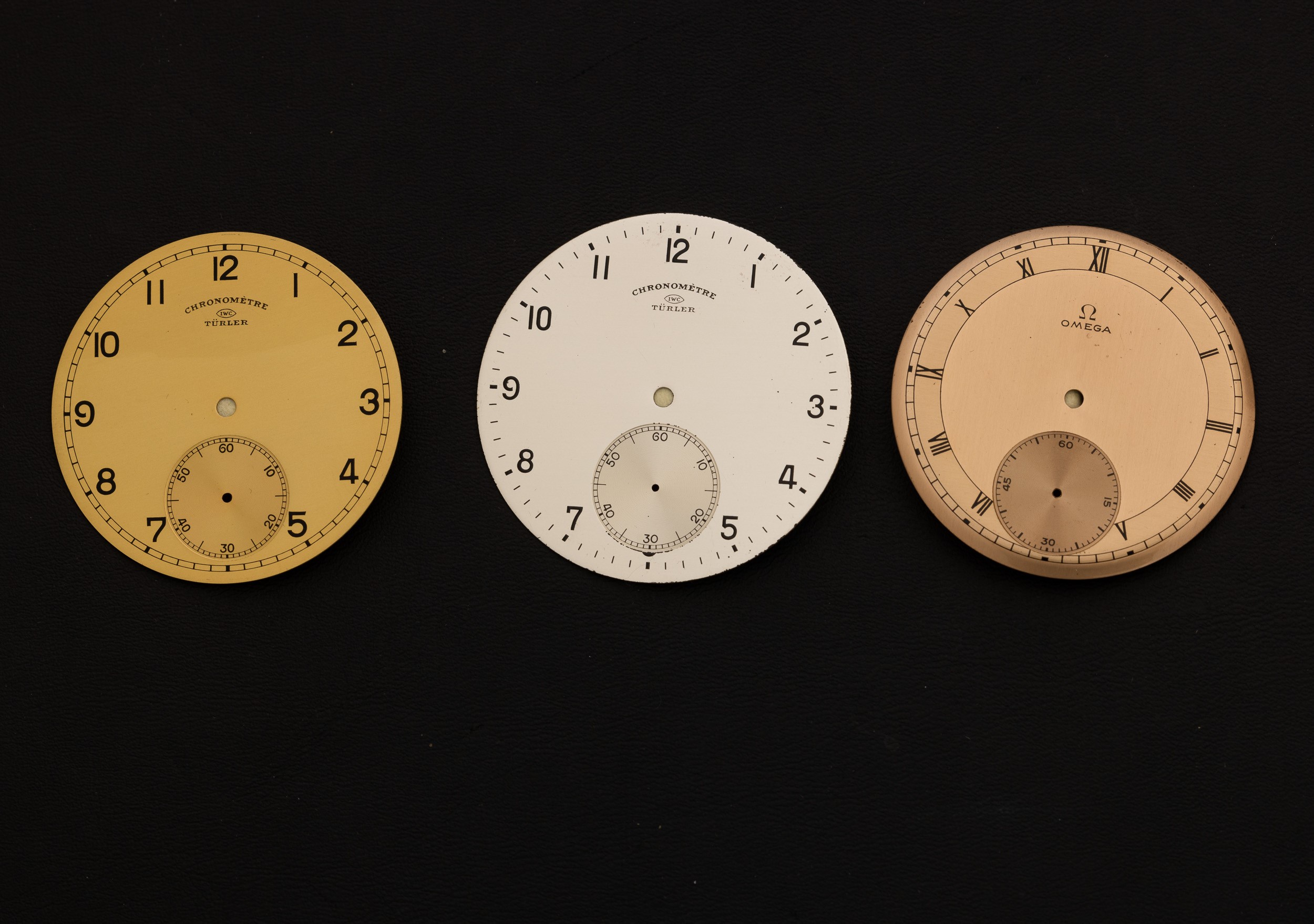 Lotto di tre quadranti IWC Champagne 40mm, Omega Salmone 40,5 mm, IWC Argento 42mm