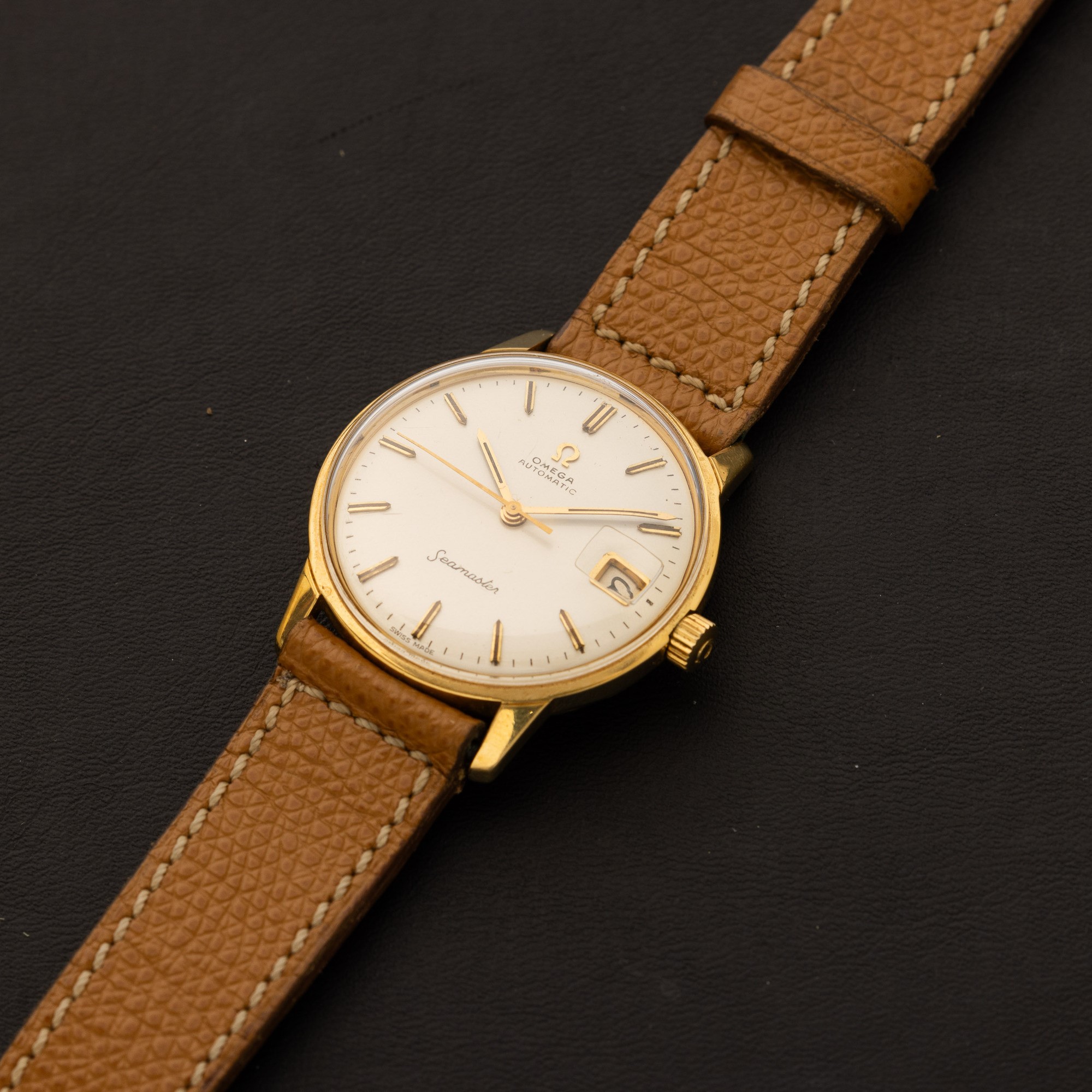 Seamaster in oro giallo 18k con movimento automatico e fondo a vite, indicazione della data, quadrante argentè con indici applicati, 34 mm