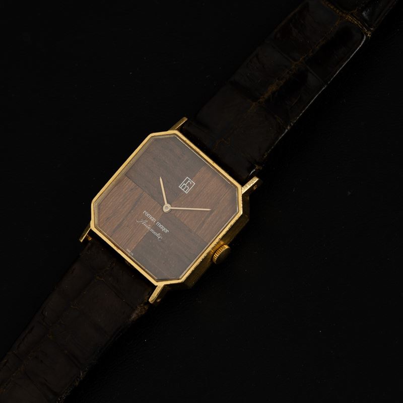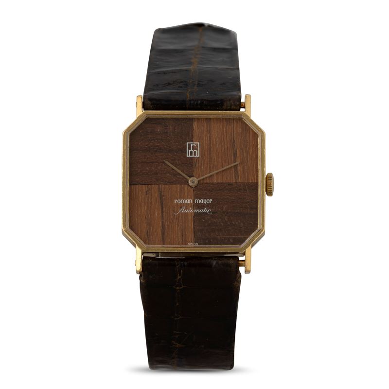 Orologio di forma automatico in oro giallo 18k quadrante in legno, 25x25 mm