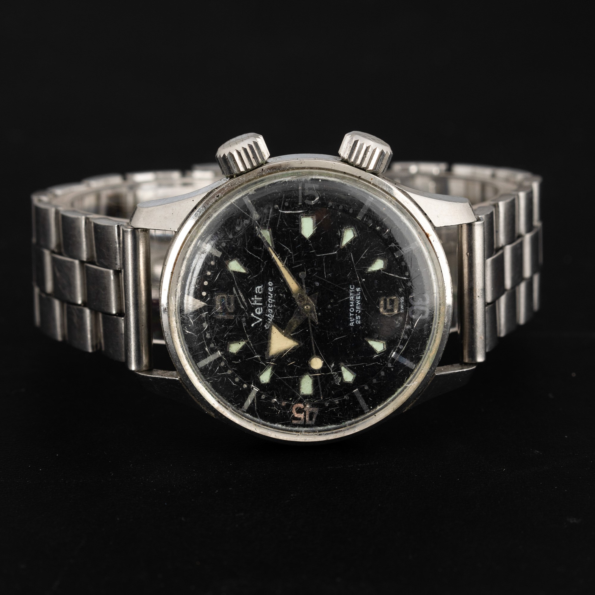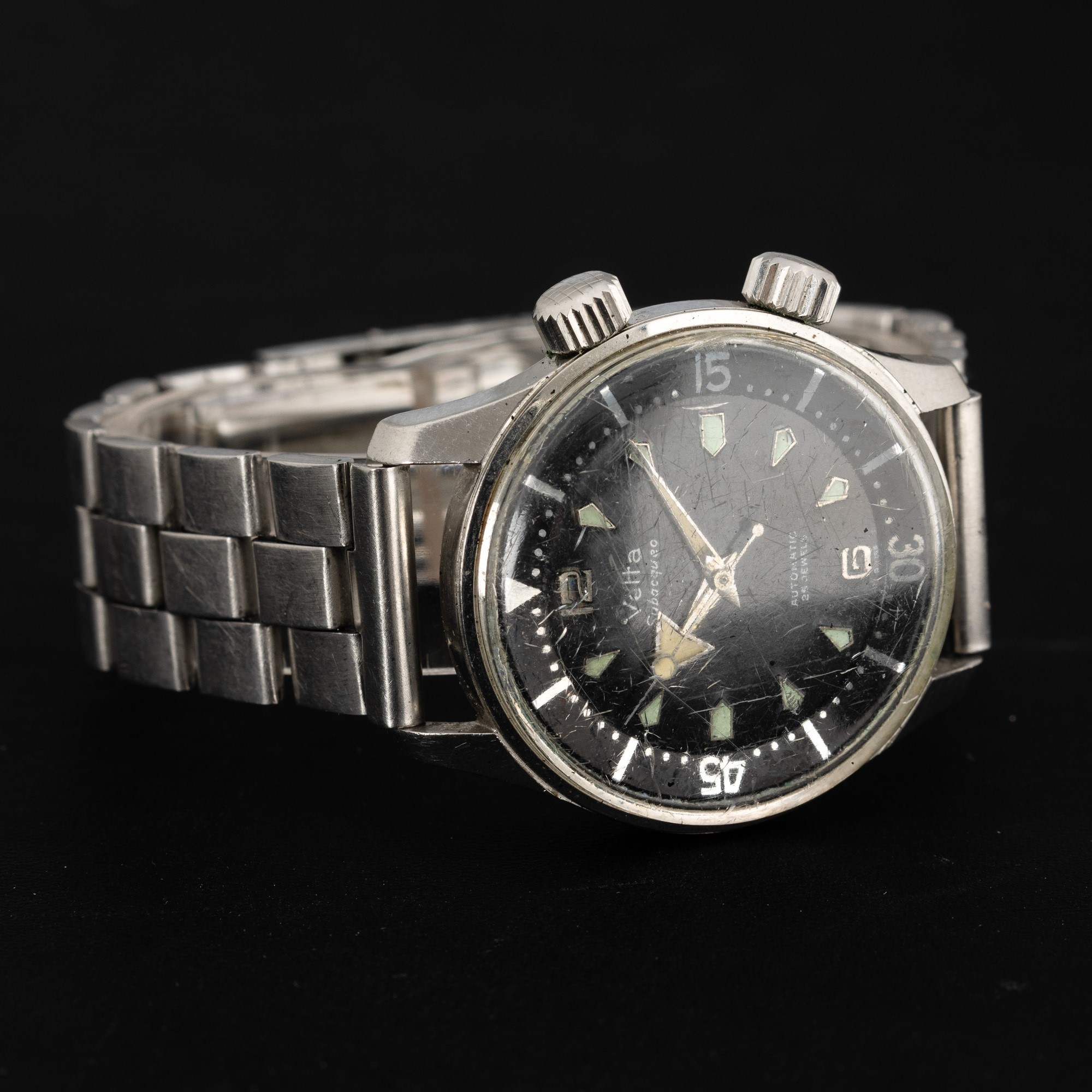 Subacqueo in acciaio doppia corona movimento automatico, quadrante nero opaco con indici applicati, 36 mm
