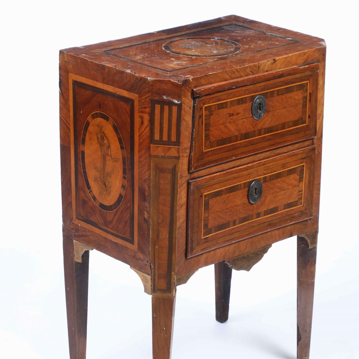 Comodino a due cassetti lastronato ed intarsiato in vari legni. XVIII secolo
