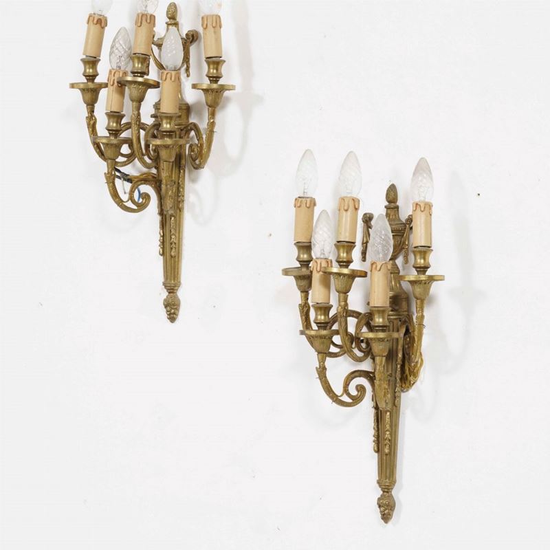 Coppia di appliques in bronzo dorato a 5 luci. XX secolo