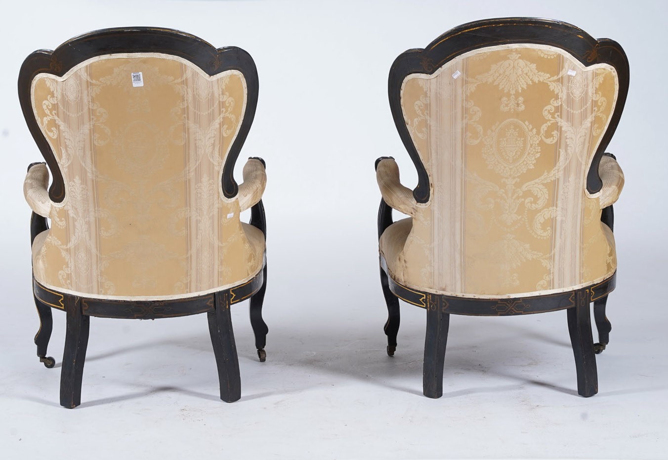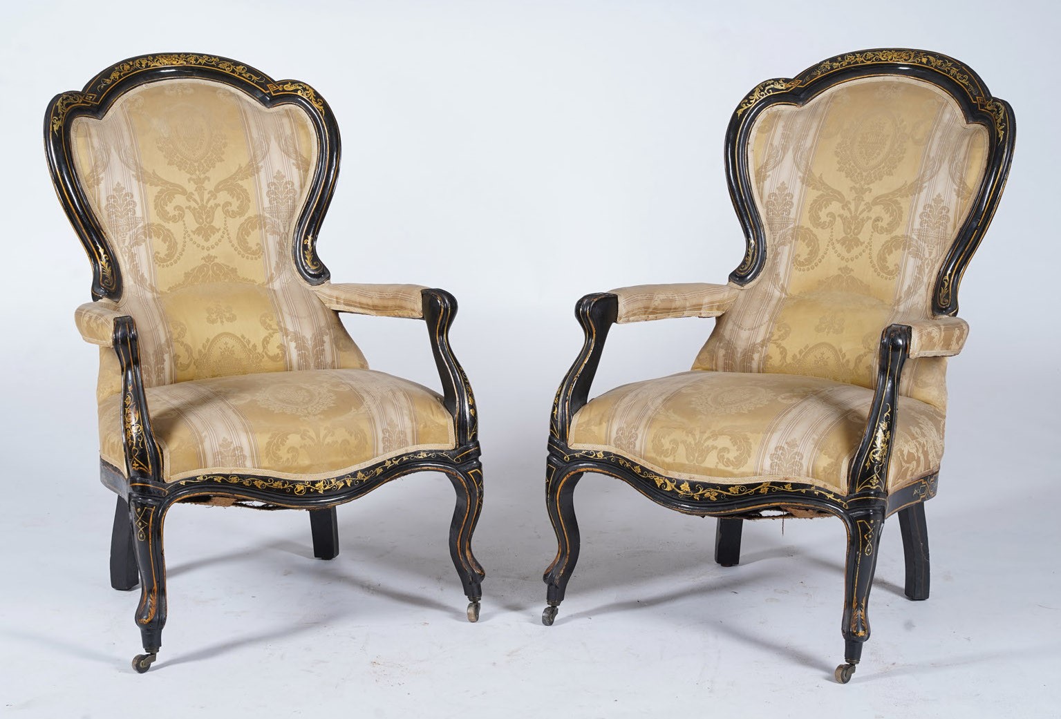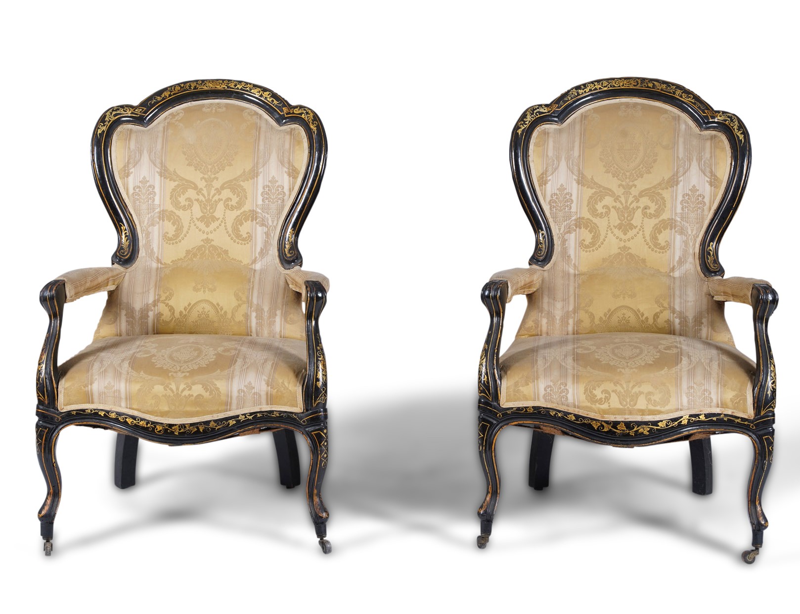 Coppia di poltrone in legno ebanizzato con decori dorati. XIX secolo