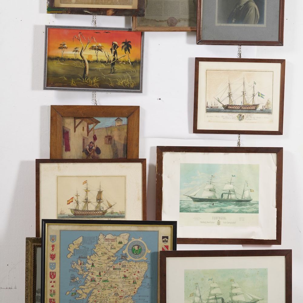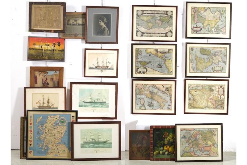 Lotto di 20 tra stampe e riproduzioni tra cui modelli di nave e cartine geografiche