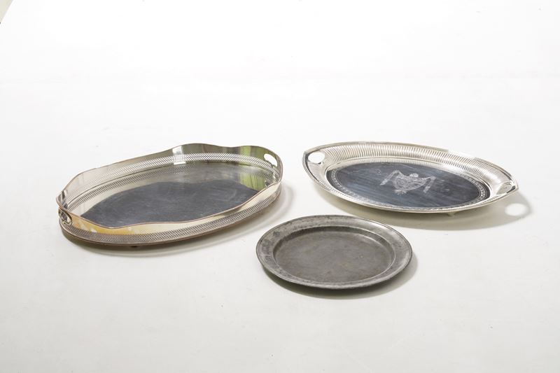 Lotto di tre vassoi; metallo, rame argentato e peltro